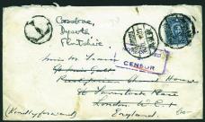 char. Cancellation and 'Not Opened By Censor' chop in blue frame. On reverse with Martyrs 1c block of 4 tied by same cds. With