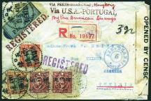 1941 (29 Aug.) An air mail registration censor cover from Tientsin to Tunis, Africa, via Peking-Shanghai-Hong Kong, via USA-