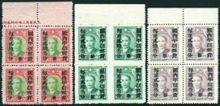 complete set of 3 in blocks of 4 with top sheet margin. Opt. on $20,000 yellow green & red, on $400,000 green, and $500,000 rose