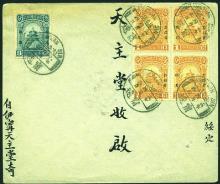 1919 (10 Jan.) A cover to Peping bearing opt 'Limited For Use In Sinkiang' on 1c ochre and 8c orange tied by bilingual 'TIHWA'