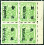 1937 Surcharged on China Mail, narrow space, 2 1/2f on 2f yellow green block of 4 with opt. double variety, unmounted mint and