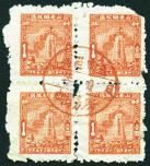 1946 Chiaotung Martyrs Monument issue, $1 orange yellow, perf., block of 4, used with complete strike of rare "Kaoyuan Fourth