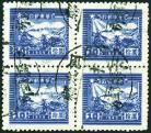 1949 Postal Runner & Train issue, Shanghai print, $10 ultramarine, block of 4, used with SzeshuihsienPienkiao Post Office _ month