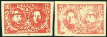 1946 Chu Teh and Chairman Mao, Antung 1st print, imperf., $15 vermilion x 2, one with very clear offset on back, unused, no gum