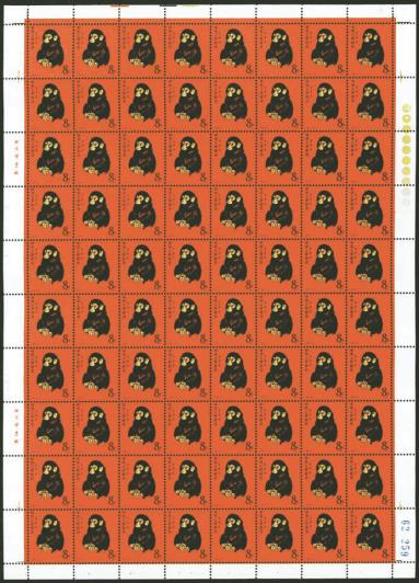 1980 T46 Year of the Monkey 8f complete sheet of 80, with plate no. 62259. Very nice gold colour on surface and a little dry gum