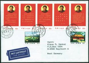 1975 (4 Sept.) An air mail cover from Peking to West Germany, bearing W10 Directives of Chairman se-tenant in strip of 5 and