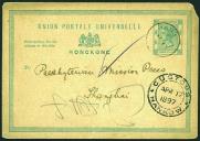 1897 (17 Apr.) AQV 1c green stationery card to Shanghai, tied by single ring 'HONG KONG' cds, 'CUSTOMS/HANKOW/17.4.97'