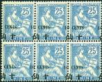 1907 Small char. surcharged 10c on 25c blue block of 6, with surcharged shifted variety. Hinged on one stamp only, fresh. Chan