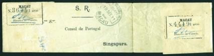 1911 (19 Sept.) Awrapper to Singapore, bearing Postmaster signature stamp 1a x 2, untied on stamps with 'MACAU' cds alongside,