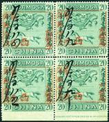 1888 Taiwan The Horse and Dragon issues, handstamped surcharged in red, 10c on 20 cash green block of 4 with bottom imprint