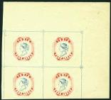 1854 India Queen Victoria Four Annas official reprint, blue and red, imperforate block of 4 with huge margins, fine unused, no gum,