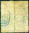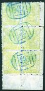 1888 Small Dragon rough perf. 5 cands olive yellow bottom corner block of 6 tied by blue 'Peking' full seal chop x 3 with few toned