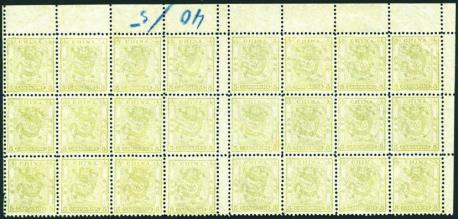 1888 Small Dragon perf. 11 1/2 5 cds olive yellow top corner block of 24 with gutter pair and margin sheet, very fresh and