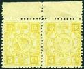 1894 Dowager 1st print, 5cds orange yellow horiz. pair with top sheet margin, unmounted mint and toned. Chan 26a. Photo