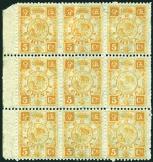 1894 Dowager 1st print 5cds dull orange block of 15 with left side margin, um and hinged at top one stamp only. Chan 26. Photo