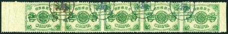 1894 Dowager 1st print 9cds dull green horiz. strip of 5 imperf. between vertically, each tied by large part 'SHANGHAI' seal chop