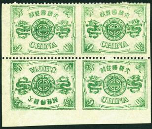 1894 Dowager first printing 9 candarins bright green block of 4 imperforate vertically and imperforate horizontally in margin at