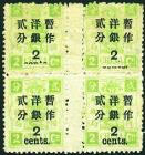1897 Dowager Large figures surcharged 2.50mm on 2nd print, 2c on 2cds yellow green block of 4 with vertical gutter pair. Top two