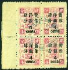 1897 Dowager large figures surcharged 2.50mm on 2nd print, 4c on 4cds pale rose block of 4 with left sheet margin, tied by full