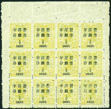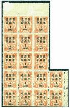 1897 Dowager Large figures surcharged 2.50mm on 2nd print, 1c on 1cd red orange, irregular block of 17 with top margin sheet,