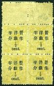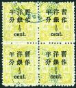 1897 Dowager Large figures surcharged 1.50mm on later 2nd print 1/2c on 3cds pale chrome block of 4 tied by large part of 'Tang-