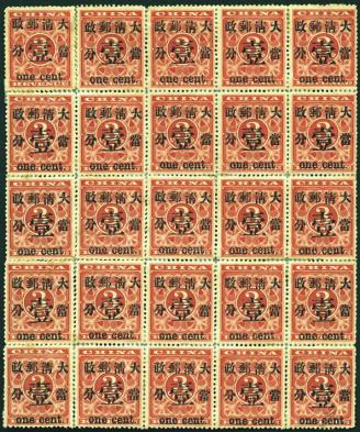 1897 Large figures surcharged 1c on 3c block of 25, with constant surcharge varieties, large box, broken char. etc. mint and dry