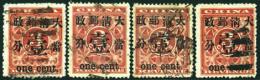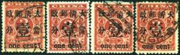 1897 Large Figures surcharged 1c on 3c x 4, one stamp with small thin at top, used. Chan 87. Photo