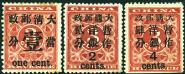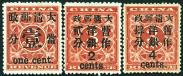 1897 Large Figures surcharged 1c on 3c with toned spots, 2c on 3c and 4c on 3c bottom perf. trimmed. Mint. Chan 87-9. Photo