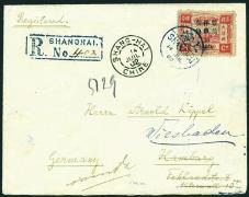 alongside 'SHANG-HAI/14.7.02' Fr.P.O cds, h/s 'R/SHANGHAI/No.401' reg. box chop. On reverse with 'HAMBURG/18.8.02' cds