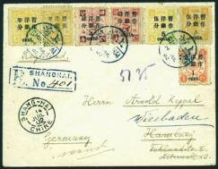 3cds, 4c on 4cds, 5c on 5cds and Large Figures surcharged 1/2c, 1c on 1cds and 5c on 5cds tied by bilingual 'SHANGHIA' cds,