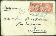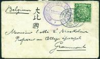 1905 A cover to Belgium, bearing Coiling Dragon 5c red in pair tied by SHANSI' '