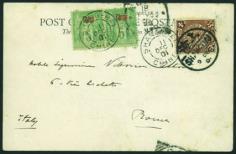 1901 (9 Dec.) Picture postcard sent to Italy, franked on front with CIP Coiling Dragon 4c, tied by SHANGHAI 9 DEC 01 bisected
