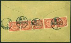1902 (16 Apr.) A cover to London, England, bearing Coiling Dragon 2c red horiz. strip of 5 tied by bilingual 'SHANGHAI' cds, one