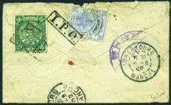 by bilingual 'CHUNGKING' cds, alongside HK QV 10c purple on red tied by 'SHANGHAI' Br.P.O transit, date not clear. With