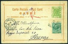 1908 Shanghai Local Post Small Dragon 20c grass green per-stamp stationery pc to Firenze, Italy. Hand painting on front. On back