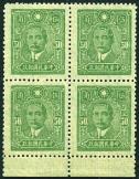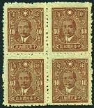 1941 Surcharged 7c on Chung Hwa print SYS 8c olive green right bottom corner block of 10 with extra perf. at the bottom variety.