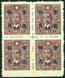 1948 Shanghai Union Press Gold Yuan surch. 50c on SYS Paicheng print $4 purple brown block of 4, bottom perf. Imperf. variety,