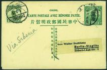 1929 (4 Mar.) A ROC 2c+2c green reply card sent to Germany, with 2nd Peking print Junk 4c tied by bilingual 'SHANGHAI' cds.