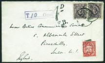in pair tied by bilingual 'SHANGHAI' cds, underneath GB postage due 1d red tied by 'LONDON/14.4.34' cds, h/s 'T/10 Ctmes'