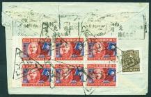 Africa 3d and 1s tied by machine chop, on reverse with SYS $100 brown and 1945 Victory $300 block of 6, tied by lager 'T' with