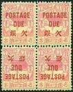 1985 Chinkiang Local Post 1st opt. 'Postage Due' on 1/2c rose block of 4 with bottom 2 stamps opt. inverted variety resulting in