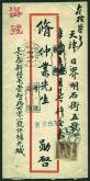 1937 (23 Sept.) A reg. cover from Sinking to Tientsin, bearing Manchukuo 1st issue 13f brown tied by 'SINKING' cds, alongside