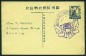 1935 (6 Dec.) A Manchukuo 1 1/2f deep blue stationery pc to Denmark, additional Manchukuo 1/2f, 1f and 3f tied by char.