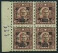 1949 Nanchang surch. 'Reminbi Currency' & char. 'Kiangsi' on SYS $20 on 3c brown lake marginal block of 4, top 2 stamps with