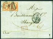 1861 (12 Aug.) An incoming entire letter from France to Shanghai, bearing Napoleon 40c orange horiz. imperf. pair. Tied by figures
