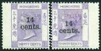 1891 QV 6th surcharged, 14c on 30c mauve x 2, each with left or right wide margin, mint and very fresh colour. Yang 49. Photo