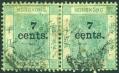 1891 QV surcharged 7c on 10c green horizontal pair, left stamp showing antique 't' of 'cents' variety, plus a single stamp with the