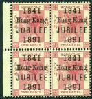 1891 QV Jubilee 2c carmine block of 4 with left sheet margin, upper left stamp with short 'U' of 'JUBILEE' variety, mint and