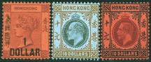 value $3, $10, KGV $5 x 2 different paper, $10, and a QV surch. $1 on 96c purple on red with Chinese char. Mostly light hinged