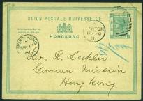 1890 (3 Dec.) Hong Kong Queen Victoria stamped postal card, 1c green, sent to Shanghai, cancelled by FOOCHOWFOO A DE 3